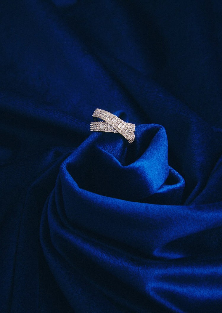 La morbidezza di un intreccio di diamanti baguette e taglio brillante, per un anello che è una magnifica esplosione di luce.