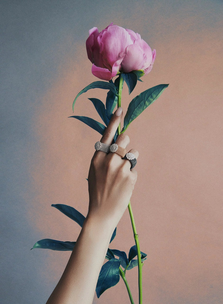 Il gambo degli anelli intrecciato in oro bianco, rosé e brunito, sostenuto dall’anima in oro, duetta con il fiore di diamanti bianchi, creando alterni contrasti.