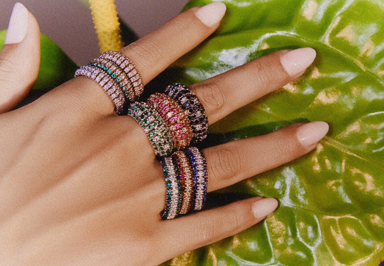 Smeraldi, zaffiri, rubini e diamanti sono incastonati in un design sinuoso a tre o cinque file, creando una composizione armoniosa che avvolge il dito con grazia ed eleganza.