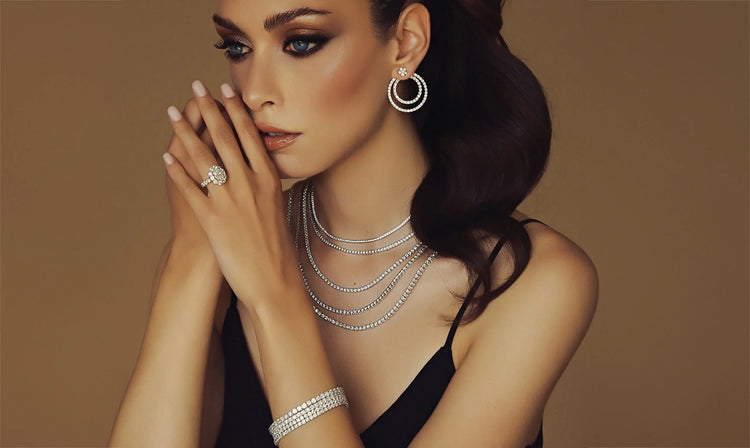 La pura bellezza dei diamanti è protagonista delle collane eternity, dell’anello con diamante ovale e brillanti, degli eleganti orecchini a doppio cerchio. Capolavori di alta gioielleria.