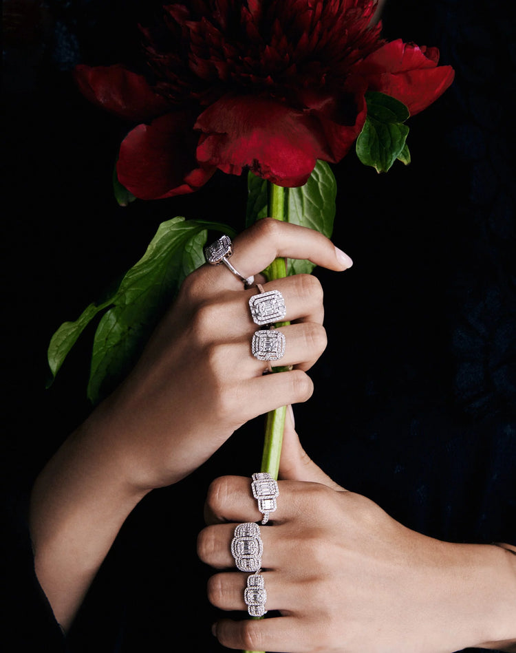 La scelta di un’eleganza discreta, che ama i dettagli preziosi, caratterizza gli anelli in oro bianco, con diamanti baguette e brillante.