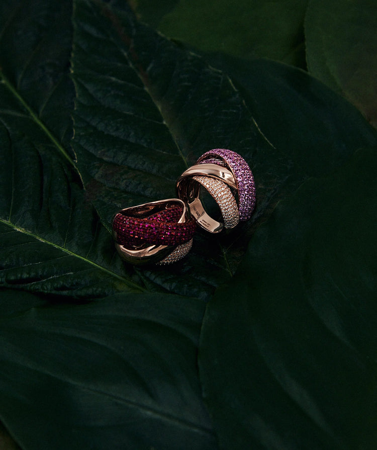 Ispirati ai rossi tramonti di Positano, gli anelli intrecciati in oro rosa con rubini e brillanti o zaffiri rosa e brillanti evocano incanto e magia.